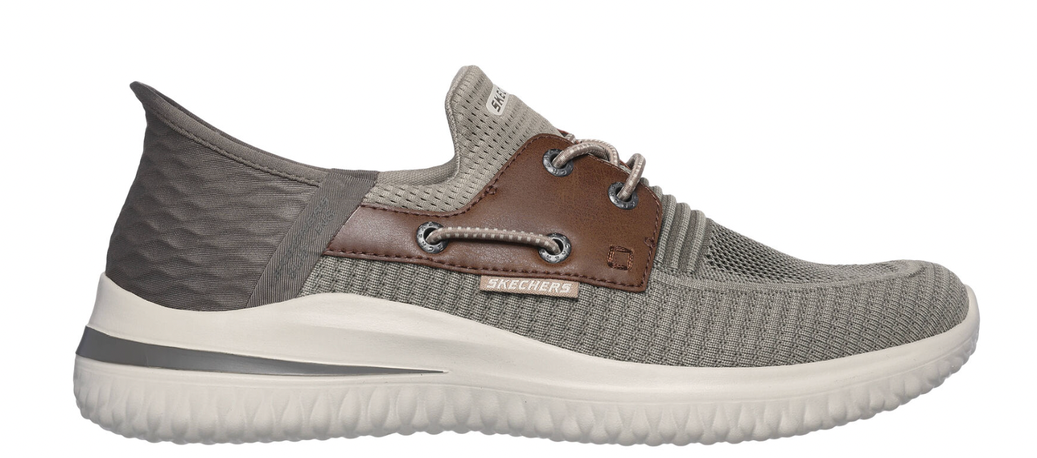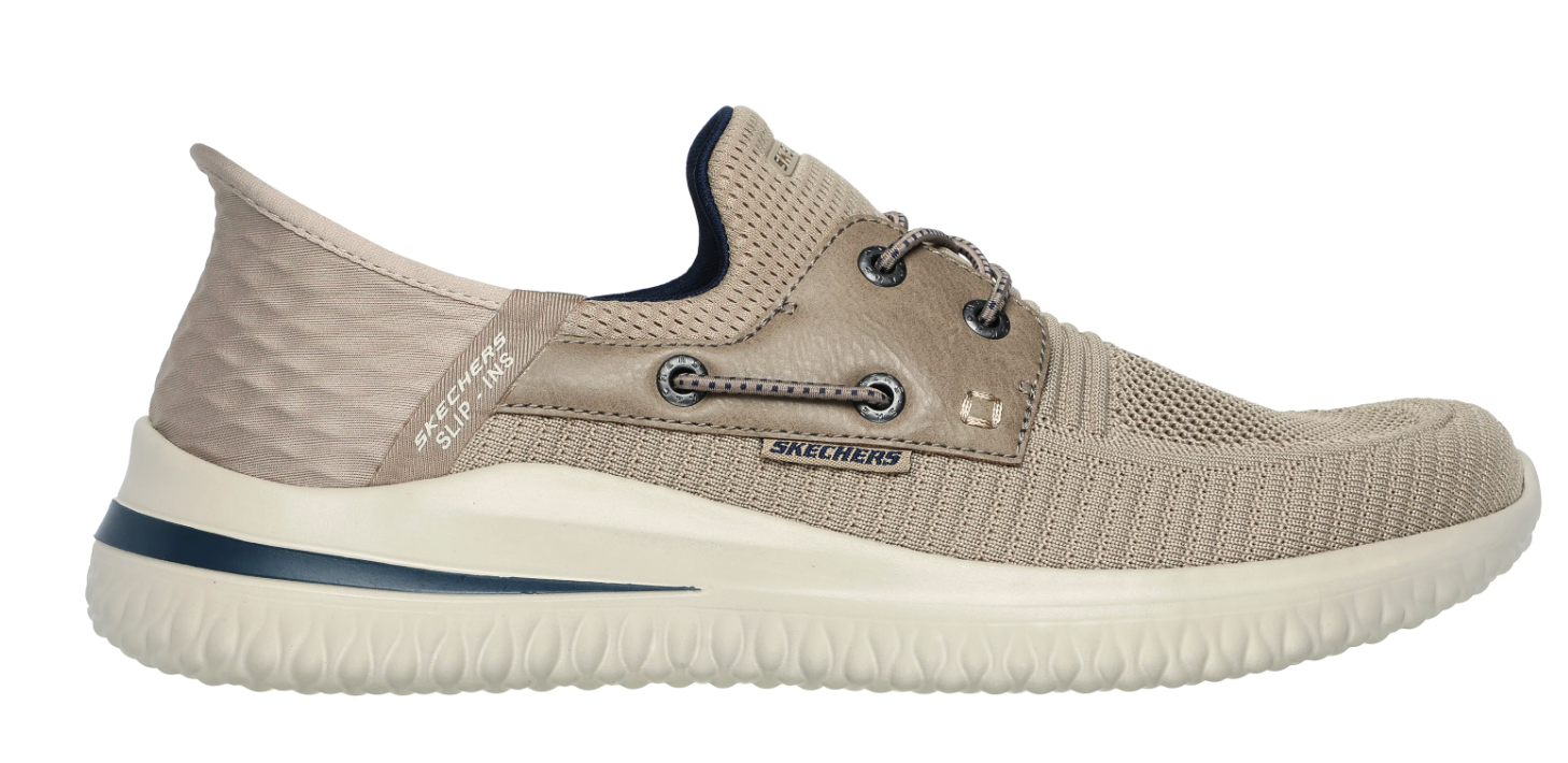 Simply step in and go wearing Skechers Hands Free Slip-ins®: Delson 3.0 - Roth. Designed with our exclusive Heel Pillow™. This Classic Fit style features an engineered knit and synthetic upper with stretch laces, a Skechers Air-Cooled Memory Foam® comfort insole and Goga Mat Arch™ cushioning for added support.